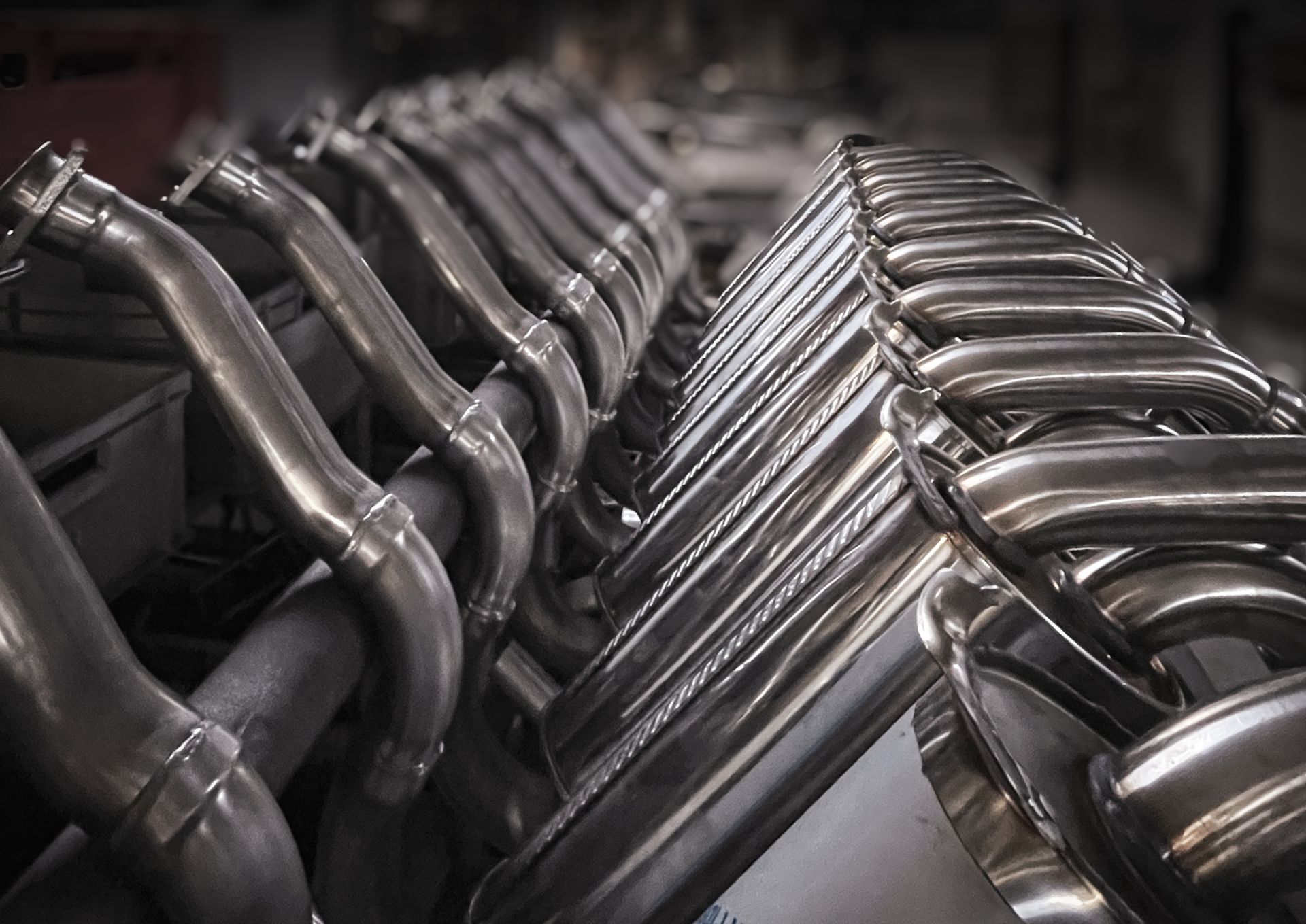 Wir fertigen Sportauspuffanlagen in Kleinserie, wobei die meisten Produkte Sonderanfertigungen sind. Das bedeutet, dass ein Großteil der Arbeit in Handarbeit erfolgt. Für die Entwicklung einer neuen Auspuffanlage benötigt unser Team etwa drei Tage, jedoch könnten wir auch bis zu fünfzig Anlagen desselben Typs pro Woche produzieren. Unsere exklusive Produktion ist anspruchsvoll und erfordert gewisse Kompromisse, weshalb wir uns auf eine begrenzte Auswahl an Marken fokussieren. Wir legen besonderen Wert auf erstklassige Verarbeitung und 100% passgenaue Lösungen. Dies gewährleisten wir durch die sorgfältige Auswahl und Verarbeitung hochwertiger Materialien, den Einsatz moderner Maschinen und die ständige Weiterentwicklung unserer Produktionsmethoden.